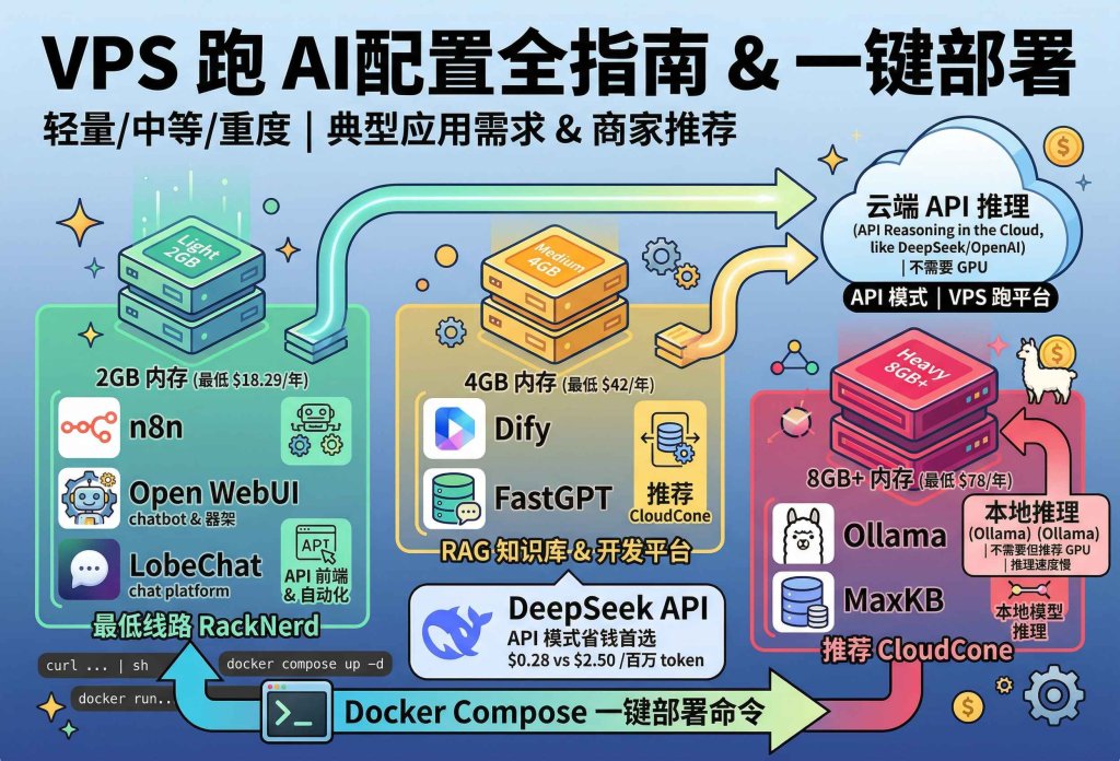 - API 模式(推荐):VPS 只跑前端/工作流平台,AI 推理交给 DeepSeek/OpenAI 等云端 API。完全不需要 GPU,2GB 内存的 VPS 就够。
